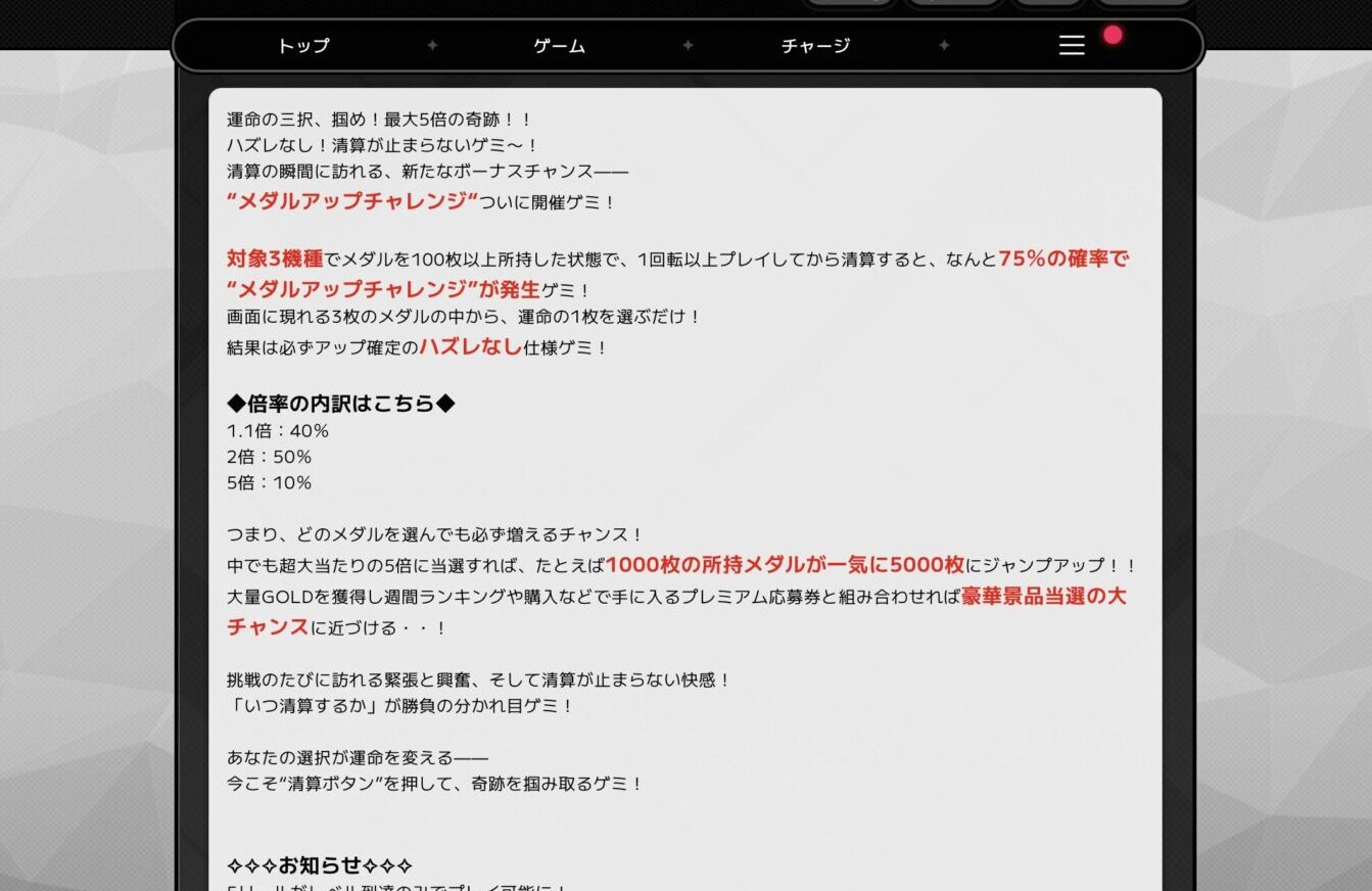 ゲミーのメダルアップチャレンジとは決められたゲームをプレイした際、終了時メダルの数を増やせるチャンスのイベントです。実際にプレイしてみたので、メダルアップチャレンジのメリットとデメリット、またやり方を解説していこうと思います。