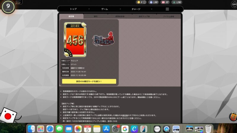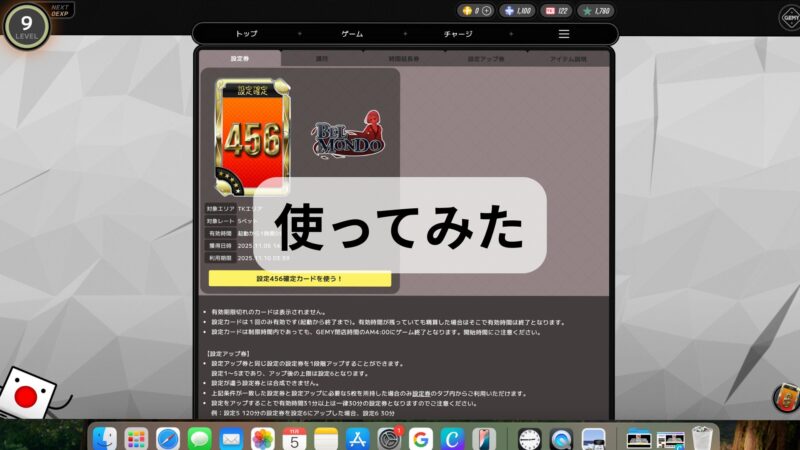 レベル9に上げたら設定券ページに飛べるようになりアイテム説明もこのように記載されています。