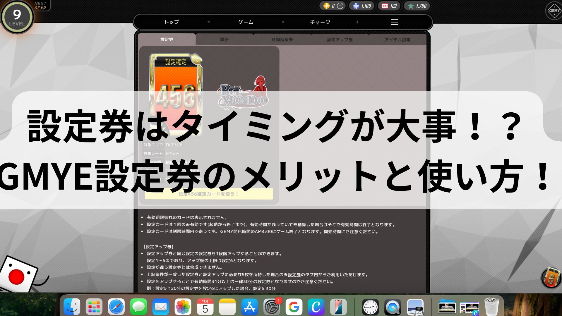 GMYEを進めていくと9レベルに上がる条件として設定券を使う場面に遭遇します。ただ初心者がいきなり設定を使えと言われても大切なジェムを5000も消費するのはためらってしまうのではないでしょうか?ということで設定券のメリットと交換するタイミングを実際にやりながら説明していこうと思います!